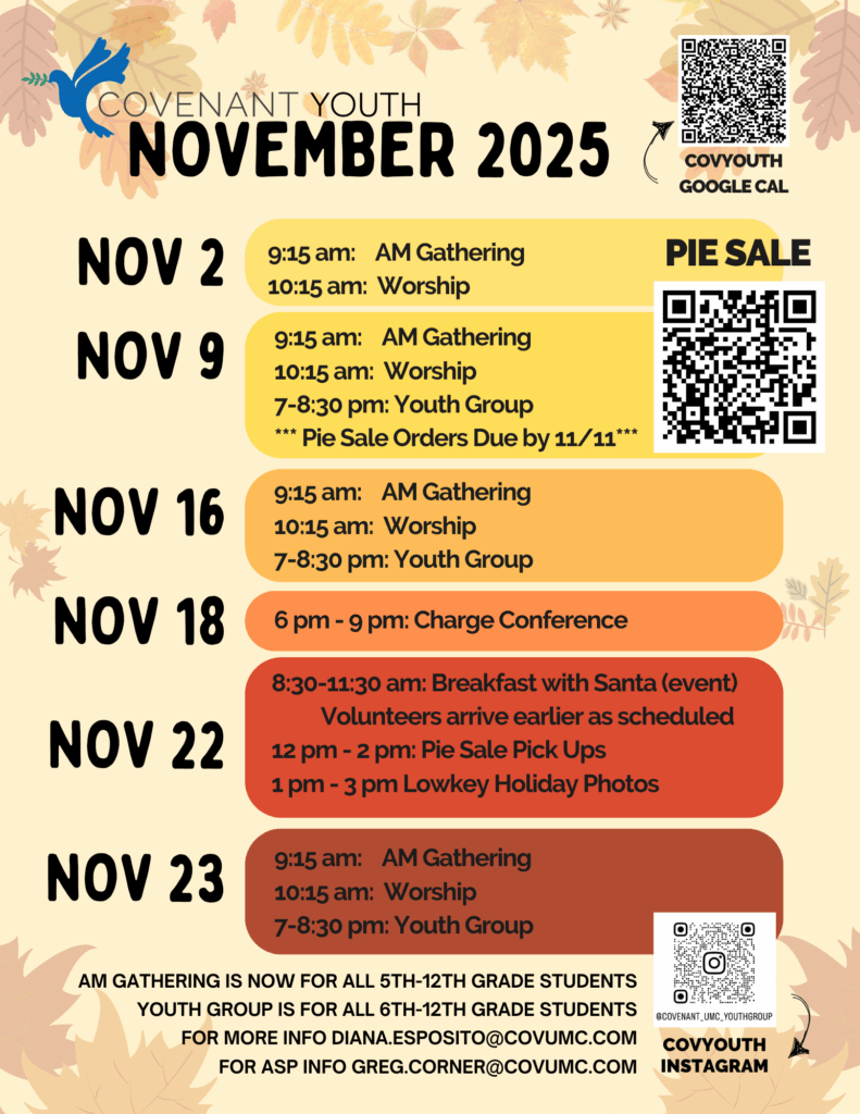 Covenant Youth AM Gatherings are open to all 5th-12th grade students. All other Covenant Youth activities are open to all 6th-12th grade students. For more information, about ASP, contact [email protected]. For more information on all other activities, contact Deacon Diana Esposito [email protected].