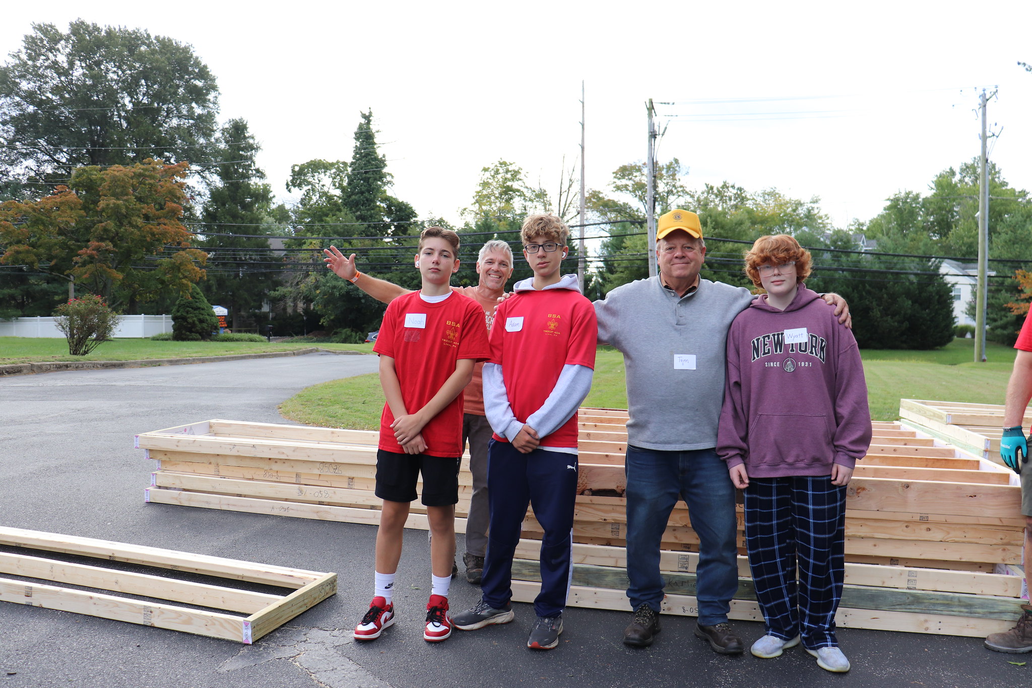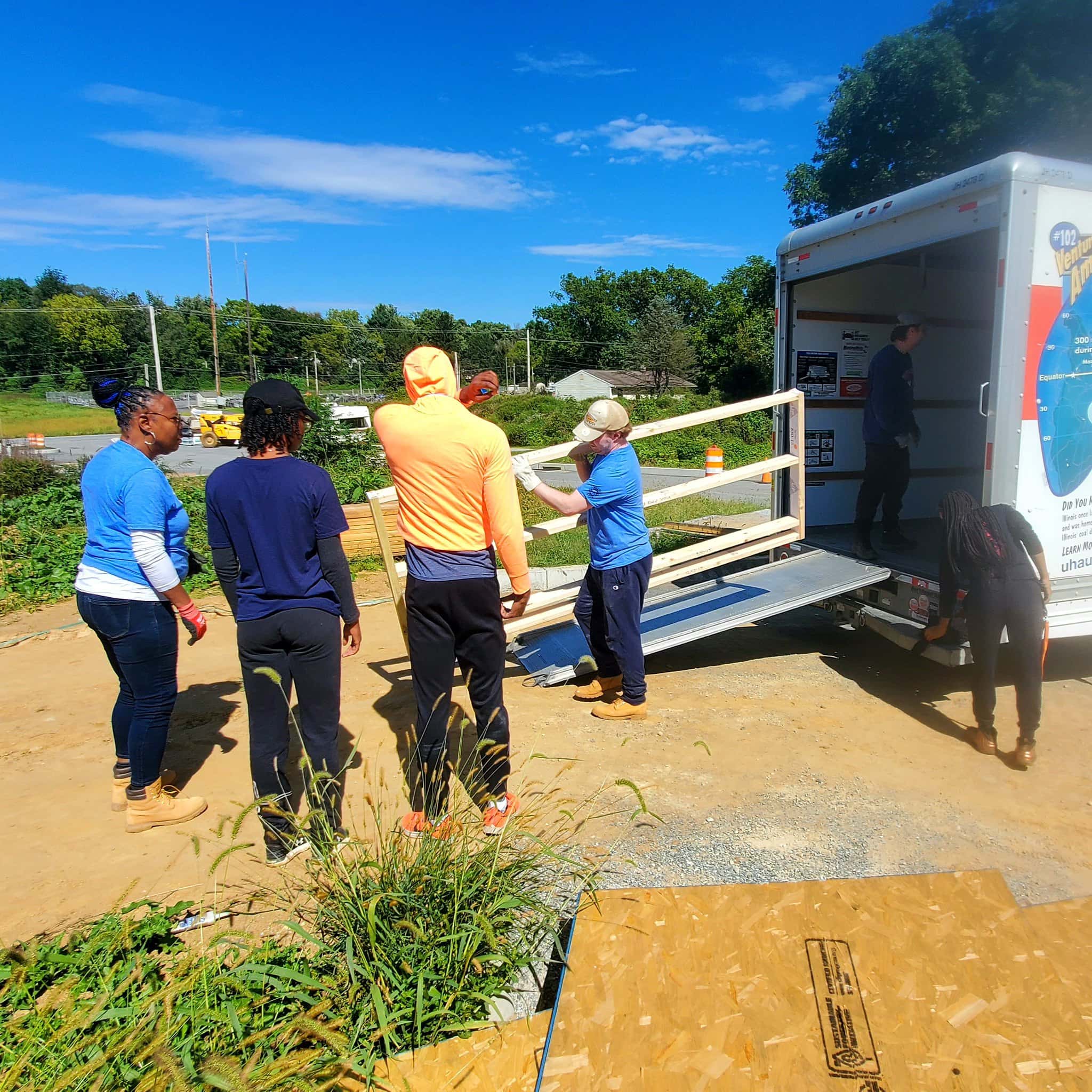 By the time most of the volunteers gathered together for lunch, almost all of the walls were complete and the hammering slowed to just a few. Volunteers had also loaded almost half of the walls into a truck to go to their new home in West Grove, PA, where Habitat for Humanity of Chester County would integrate them into the build of five townhomes, part of a larger development of forty. After lunch, all of the walls for one unit were assembled in the parking lot and the rest of the walls were loaded into the truck for a second trip. In all, volunteers fashioned more than 1300 pieces of wood into more than 100 walls – each wall etched with their love and compassion.