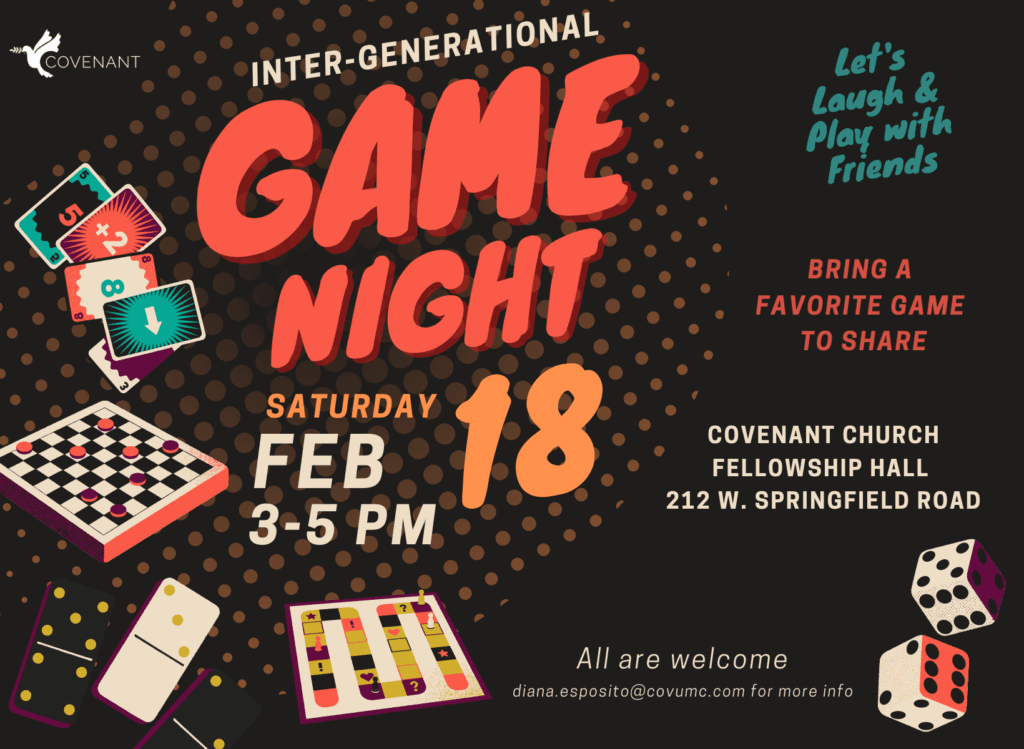 Covenant is hosting a Game Night for people of all ages — bring your favorite board game to share or play one we have. Children, youth, families, couples, adult singles… everyone is welcome to join us to play games.
