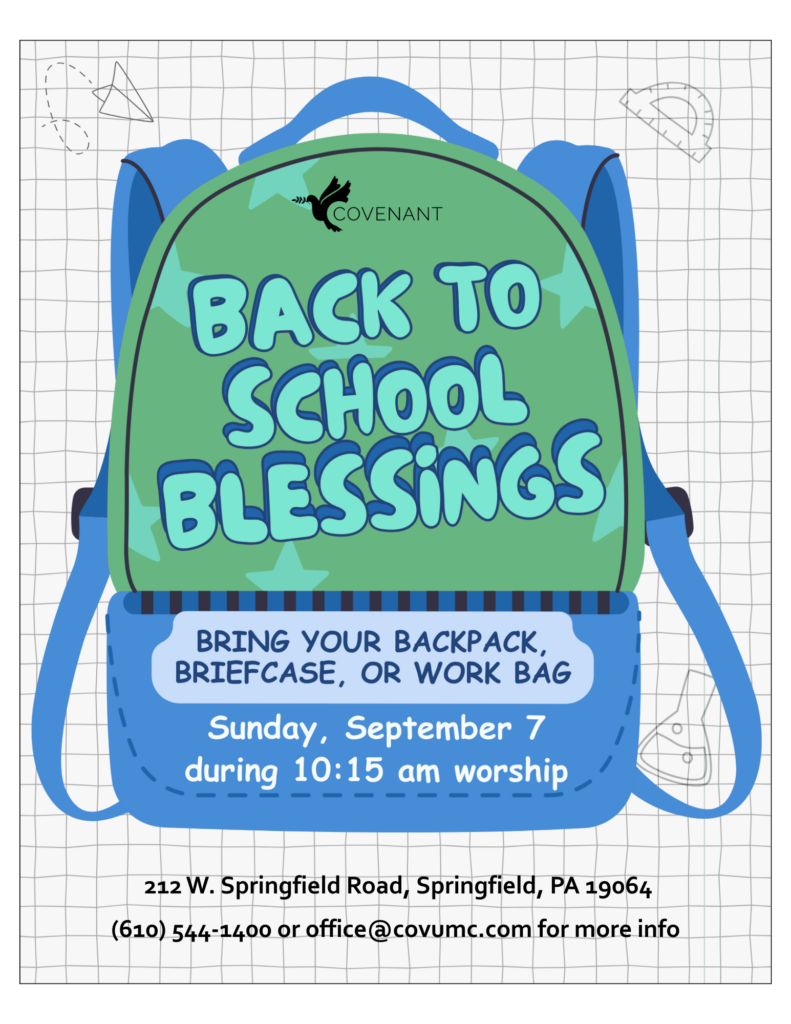 Everyone is welcome in worship in the sanctuary! During worship there will be a time for blessing of any backpacks, briefcases, and other work bags – blessing of the backpacks is for people of all ages who carry bags to and from school, work, or in their daily travel around the neighborhood.