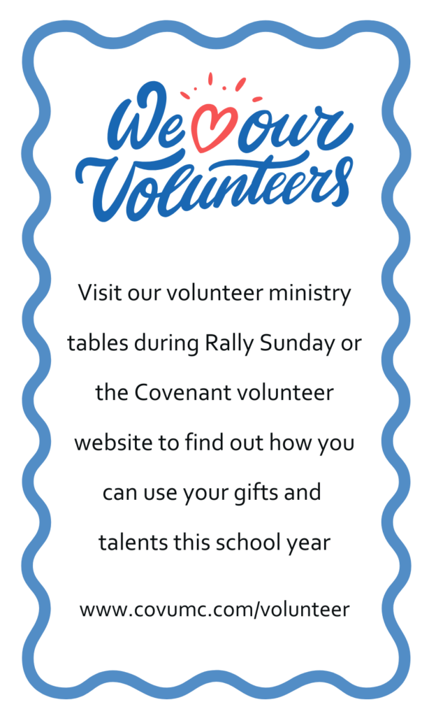 Youth (students in 6th-12th grade) can eat all three meals at Covenant on Rally Sunday!!! Youth can plan on a night of games, fellowship, and schedule planning. Youth will also be provided with more information about upcoming opportunities to get involved — Ignite Conference, Children and Youth Sunday, Help Build Hope, ASP Pumpkin Patch, Trunk or Treat, and more! Friends in 6th-12th grade are always welcome!